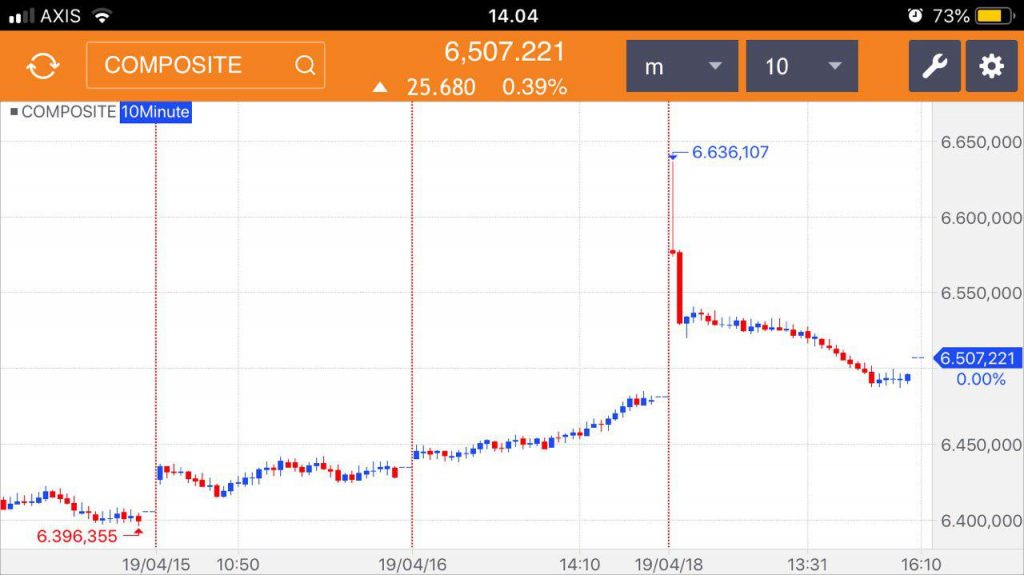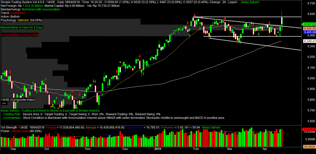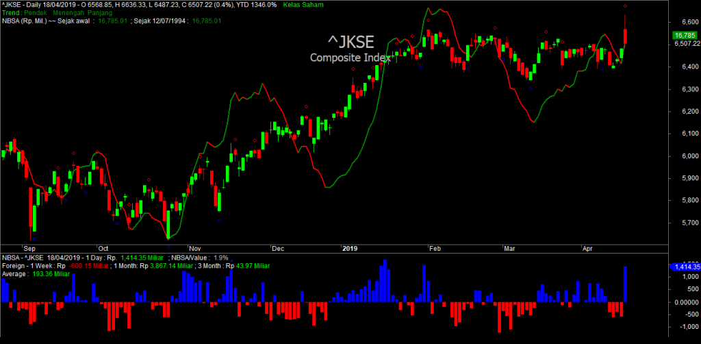 Satu hari setelahnya, yaitu hari kamis 18 April 2019 IHSG dibuka dengan kenaikan yang signifikan saat awal pembukaan. Tidak tanggung-tanggung, kenaikannya sebesar 2,39%.